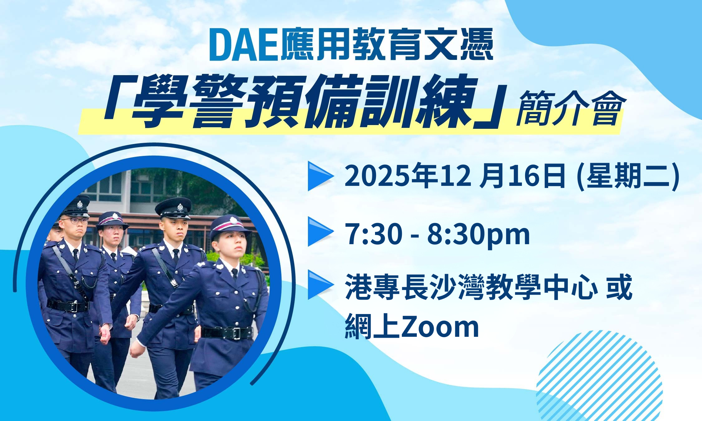 應用教育文憑Diploma of Applied Education - 港專已是第5年參與香港警務處的招募計劃「志警成計劃」,現時接近50%的計劃學員都是港專紀律部隊或警備訓練的學生